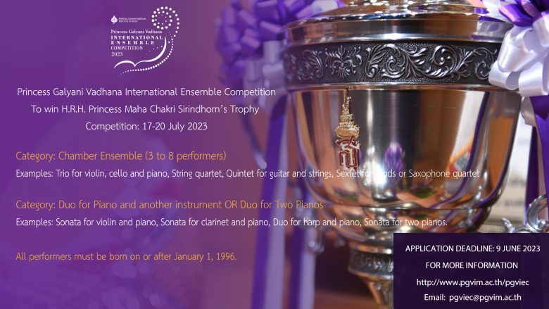 tui sakrapee April 14, 2023 สถาบันดนตรีกัลยาณิวัฒนา เชิญเยาวชนร่วมแข่งขันวงดนตรีนานาชาติ รางวัลสมเด็จพระกนิษฐาธิราชเจ้า กรมสมเด็จพระเทพรัตนราชสุดา ฯ สยามบรมราชกุมารี tui sakrapee April 14, 2023 สถาบันดนตรีกัลยาณิวัฒนา และโครงการแข่งขันวงดนตรีนานาชาติ รางวัลสมเด็จพระกนิษฐาธิราชเจ้า กรมสมเด็จพระเทพรัตนราชสุดา ฯ สยามบรมราชกุมารี ขอเชิญเยาวชนดนตรีเข้าร่วมการแข่งขัน “การแข่งขันวงดนตรีนานาชาติ ชิงถ้วยพระราชทานจากสมเด็จพระกนิษฐาธิราชเจ้า กรมสมเด็จพระเทพรัตนราชสุดา ฯ สยามบรมราชกุมารี Princess Galyani Vadhana International Ensemble Competition 2023” ประเภทการแข่งขัน Category B: Chamber Ensemble (วงดนตรีประเภทบรรเลงกลุ่ม จำนวนผู้บรรเลง 3-8 คน) โดยไม่มีผู้อำนวยเพลง รางวัลที่ 1 100,000.-… Continue Reading