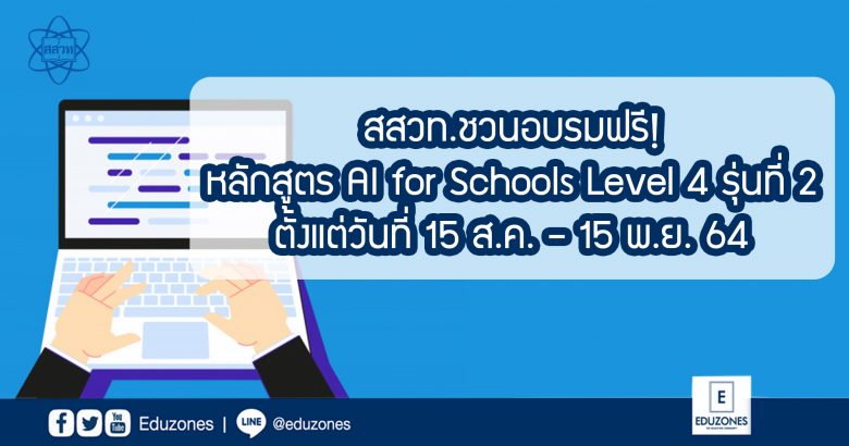 EZ Webmaster August 15, 2021 สสวท.ชวนอบรมฟรี! หลักสูตร AI for Schools Level 4 รุ่นที่ 2 ตั้งแต่วันที่ 15 ส.ค. – 15 พ.ย. 64 EZ Webmaster August 15, 2021 สถาบันส่งเสริมการสอนวิทยาศาสตร์และเทคโนโลยี (สสวท.) จัดอบรม หลักสูตรอบรมออนไลน์ปัญญาประดิษฐ์สำหรับโรงเรียน หลักสูตร 4 (AI for Schools Level 4) รุ่นที่ 2 ฟรี ไม่มีค่าใช้จ่าย โดยจะเปิดอบรมตั้งแต่วันที่ 15 สิงหาคม – 15 พฤศจิกายน 2564 กำหนดการ -เปิดรับสมัครและอบรม ตั้งแต่วันที่ 15 สิงหาคม – 15 พฤศจิกายน 2564… Continue Reading