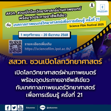 EZ Webmaster November 24, 2025 สสวท. ชวนเปิดโลกวิทยาศาสตร์ผ่านภาพยนตร์ พร้อมจุดประกายอาชีพสีเขียว กับเทศกาลภาพยนตร์วิทยาศาสตร์เพื่อการเรียนรู้ ครั้งที่ 21 EZ Webmaster November 24, 2025 สสวท. ชวนเปิดโลกวิทยาศาสตร์ผ่านภาพยนตร์ พร้อมจุดประกายอาชีพสีเขียว กับเทศกาลภาพยนตร์วิทยาศาสตร์เพื่อการเรียนรู้ ครั้งที่ 21 แสง สี เสียง และเรื่องราวแห่งแรงบันดาลใจได้กลับมาอีกครั้ง! กับ “เทศกาลภาพยนตร์วิทยาศาสตร์เพื่อการเรียนรู้ ครั้งที่ 21 (Science Film Festival 2025)” พร้อมพาผู้ชมทุกวัยออกเดินทางสู่โลกของ “วิทยาศาสตร์ที่มีชีวิต” ผ่านภาพยนตร์จากทั่วโลกกว่า 28 เรื่อง จาก 14 ประเทศ ที่จะทำให้ทุกคนเห็นว่า วิทยาศาสตร์ไม่ได้อยู่แค่ในห้องเรียน แต่แทรกอยู่ในทุกมุมของชีวิตจริง เทศกาลในปีนี้มาในแนวคิดสุดทันสมัย “Green Jobs – งานสีเขียว” เพื่อจุดประกายเยาวชนให้ตระหนักถึงอาชีพแห่งอนาคตที่เติบโตคู่กับการดูแลรักษ์โลก และชวนทุกคนค้นหาอาชีพแห่งอนาคตที่ยั่งยืน และเป็นมิตรต่อสิ่งแวดล้อม พร้อมทั้งกิจกรรมฉายภาพยนตร์ทั่วประเทศ… Continue Reading