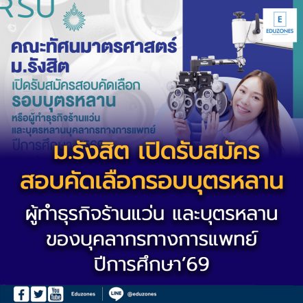 คณะทัศนมาตรศาสตร์ ม.รังสิต เปิดรับสมัครสอบคัดเลือก รอบบุตรหลาน หรือผู้ทำธุรกิจร้านแว่น และบุตรหลานของบุคลากรทางการแพทย์ ปีการศึกษา’69 EZ WebmasterApril 21, 2026 คณะทัศนมาตรศาสตร์ มหาวิทยาลัยรังสิต เปิดรับสมัครสอบคัดเลือกบุคคลเข้าศึกษาต่อในระดับปริญญาตรี หลักสูตรทัศนมาตรศาสตรบัณฑิต รอบบุตรหลานหรือผู้ทำธุรกิจร้านแว่น และบุตรหลานของบุคลากรทางการแพทย์ ประจำปีการศึกษา 2569 โดยมีคุณสมบัติเฉพาะดังนี้ 1. รับสมัคร ผู้สำเร็จการศึกษาระดับมัธยมปลาย สายวิทย์-คณิต เกรดเฉลี่ย 2.50 ขึ้นไป หรือสายศิลป์-คำนวณ เกรดเฉลี่ย…