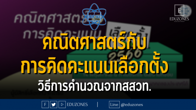 EZ Webmaster May 15, 2023 คณิตศาสตร์กับ การคิดคะแนนเลือกตั้ง : วิธีการคำนวณจากสสวท. EZ Webmaster May 15, 2023 ช่วงการเลือกตั้งแบบนี้ สงสัยกันไหมคะว่า เมื่อได้คะแนนมาแล้วต้องคำนวณอย่างไร? วันนี้สสสวท. เผยคณิตศาสตร์กับการคิดคะแนนเลือกตั้ง : วิธีการคำนวณจากสสวท. โดยใช้เพียงความรู้คณิตศาสตร์ระดับ ม.ต้น ก็สามารถทำความเข้าใจได้ไม่ยาก . ในการเลือกตั้ง ผู้มีสิทธิเลือกตั้งจะได้รับบัตรเลือกตั้ง จำนวน 2 ใบ ได้แก่ บัตรสีม่วง เลือกผู้สมัครตามเขตเลือกตั้งของตนเอง 1 คน โดย ส.ส. แบบแบ่งเขตเลือกตั้ง จะได้มาจากผู้สมัครที่ได้รับคะแนนสูงสุดของแต่ละเขตเลือกตั้งจาก 400 เขตเลือกตั้ง เขตเลือกตั้งละ 1 คน รวมจำนวน ส.ส.… Continue Reading