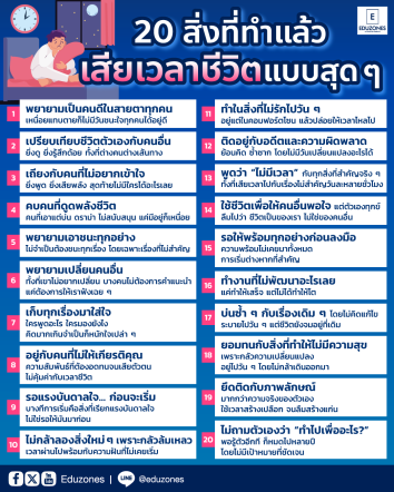 มทร.ธัญบุรี พร้อมปั้นบัณฑิตสู่ยุค NEXT GEN การันตีความสำเร็จด้วยคลื่นมหาชน tui sakrapeeDecember 4, 2025 มหาวิทยาลัยเทคโนโลยีราชมงคลธัญบุรี (มทร.ธัญบุรี) สร้างปรากฏการณ์ครั้งสำคัญในแวดวงการศึกษาไทยผ่านงาน ‘RMUTT NEXT GEN: Open House 2026 : เปิดประตูสู่ราชมงคลธัญบุรี 69’ เมื่อวันที่ 27 และ 28 พฤศจิกายน 2568… ม.กรุงเทพ จัดงาน The Shape of Tomorrow: Bangkok Art & Architecture @Dib Bangkok tui sakrapeeDecember 4, 2025 คณะสถาปัตยกรรมศาสตร์ มหาวิทยาลัยกรุงเทพ จัดงาน “The Shape of Tomorrow: Bangkok Art & Architecture” เปิดพื้นที่แลกเปลี่ยนองค์ความรู้และประสบการณ์ระหว่างนักวิชาการ ผู้เชี่ยวชาญในวงการสถาปัตยกรรมที่มุ่งเน้นแนวคิดการออกแบบที่ตอบโจทย์ความยั่งยืน (Sustainability) และการปรับใช้พื้นที่อาคารให้เกิดคุณค่าใหม่ (Adaptive Reuse) โดยปรับเปลี่ยนพื้นที่เดิมให้กลายเป็นพื้นที่สร้างสรรค์อย่าง… มหาวิทยาลัยราชภัฏสวนสุนันทา จับมือ “เอ็ม พาวเวอร์ คอร์ปอเรชั่น” ลงนาม MOU ขับเคลื่อนระบบจัดการวัสดุรีไซเคิล สู่มหาวิทยาลัยสีเขียวอย่างยั่งยืน tui sakrapeeDecember 4, 2025 เมื่อวันพฤหัสบดีที่ 4 ธันวาคม 2568 มหาวิทยาลัยราชภัฏสวนสุนันทา จัดพิธีลงนามบันทึกความเข้าใจ (MOU) ร่วมกับบริษัท เอ็ม พาวเวอร์ คอร์ปอเรชั่น จำกัด ณ ห้องประชุมสภามหาวิทยาลัย เพื่อขับเคลื่อนการพัฒนาระบบการจัดการวัสดุรีไซเคิลภายในมหาวิทยาลัยอย่างเป็นรูปธรรมและยั่งยืน พิธีลงนามในครั้งนี้มีวัตถุประสงค์เพื่อพัฒนากลไกการจัดการวัสดุรีไซเคิลให้มีประสิทธิภาพยิ่งขึ้น ส่งเสริมการคัดแยกขยะอย่างถูกต้อง เพิ่มคุณค่าและสร้างรายได้จากวัสดุที่สามารถนำกลับมาใช้ใหม่… สุดเจ๋ง! สถานศึกษาอาชีวะ รับรางวัลโครงการชีววิถีฯ ระดับประเทศ ประจำปี 2568 สานต่อปณิธานหลักปรัชญาเศรษฐกิจพอเพียงของพ่อหลวงรัชกาลที่ 9 EZ WebmasterDecember 3, 2025 สุดเจ๋ง! สถานศึกษาอาชีวะ รับรางวัลโครงการชีววิถีฯ ระดับประเทศ ประจำปี 2568 สานต่อปณิธานหลักปรัชญาเศรษฐกิจพอเพียงของพ่อหลวงรัชกาลที่ 9 วันนี้ (1 ธ.ค. 68) นายยศพล เวณุโกเศศ เลขาธิการคณะกรรมการการอาชีวศึกษา มอบหมายให้ นายสง่า แต่เชื้อสาย… Search for: Search Tag: 20 สิ่งที่ทำแล้วเสียเวลาชีวิตแบบสุด ๆ EZ Webmaster July 22, 2025 20 สิ่งที่ทำแล้วเสียเวลาชีวิตแบบสุด ๆ EZ Webmaster July 22, 2025 1. พยายามเป็นคนดีในสายตาทุกคนเหนื่อยแทบตายก็ไม่มีวันชนะใจทุกคนได้อยู่ดี2. เปรียบเทียบชีวิตตัวเองกับคนอื่นยิ่งดู ยิ่งรู้สึกด้อย ทั้งที่ต่างคนต่างเส้นทาง3. เถียงกับคนที่ไม่อยากเข้าใจยิ่งพูด ยิ่งเสียพลัง สุดท้ายไม่มีใครได้อะไรเลย4. คบคนที่ดูดพลังชีวิตคนที่เอาแต่บ่น ดราม่า ไม่สนับสนุน แค่มีอยู่ก็เหนื่อย5. พยายามเอาชนะทุกอย่างไม่จำเป็นต้องชนะทุกเรื่อง โดยเฉพาะเรื่องที่ไม่สำคัญ6. พยายามเปลี่ยนคนอ