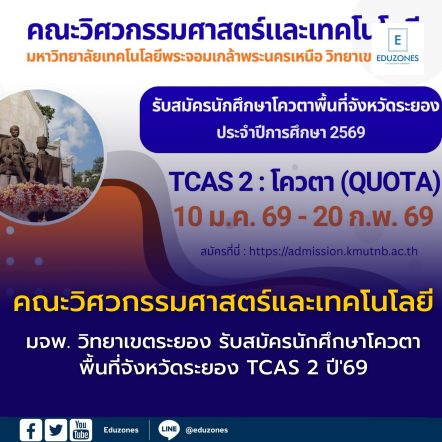 EZ Webmaster January 14, 2026 คณะวิศวกรรมศาสตร์และเทคโนโลยี มจพ. วิทยาเขตระยอง รับสมัครนักศึกษาโควตาพื้นที่จังหวัดระยอง TCAS 2 ปี’69 EZ Webmaster January 14, 2026 คณะวิศวกรรมศาสตร์และเทคโนโลยี มจพ. วิทยาเขตระยอง รับสมัครนักศึกษาโควตาพื้นที่จังหวัดระยอง TCAS 2 ปี’69 คณะวิศวกรรมศาสตร์และเทคโนโลยี มหาวิทยาลัยเทคโนโลยีพระจอมเกล้าพระนครเหนือ วิทยาเขตระยอง ประกาศรับสมัครนักศึกษาโควตาพื้นที่จังหวัดระยอง ประจำปีการศึกษา 2569 (TCAS 2) รายละเอียดดังนี้ 📢 เปิดรับสมัครทางอินเทอร์เน็ตตั้งแต่วันที่ 10 มกราคม 2569 ถึง วันที่ 20 กุมภาพันธ์ 2569 สามารถสมัครได้ที่ www.admission.kmutnb.ac.th/ ✅ประกาศรายชื่อผู้มีสิทธิ์สอบสัมภาษณ์วันที่ 27 กุมภาพันธ์ 2569… Continue Reading