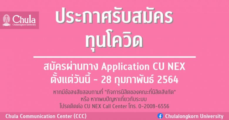 tui sakrapee February 8, 2021 จุฬาฯ ให้ทุนนิสิตที่ได้รับผลกระทบจากการแพร่ระบาด COVID-19 tui sakrapee February 8, 2021 นิสิตจุฬาฯ ที่ได้รับผลกระทบจากการแพร่ระบาดของเชื้อไวรัส COVID-19 สามารถลงทะเบียนเพื่อขอรับการพิจารณารับทุนช่วยเหลือได้แล้ว โดยสามารถสมัครขอรับทุนผ่านทาง Application CU NEX ตั้งแต่วันนี้ – 28 กุมภาพันธ์ 2564 หากมีข้อสอบถามเกี่ยวกับทุนฯ สามารถติดต่อได้ที่ฝ่ายกิจการนิสิตของคณะที่นิสิตสังกัด หรือหากพบปัญหาเกี่ยวกับระบบ โปรดติดต่อที่ CU NEX Call Center โทร.0-2008-6556 ทุกวัน ตลอด 24 ชั่วโมง Continue Reading