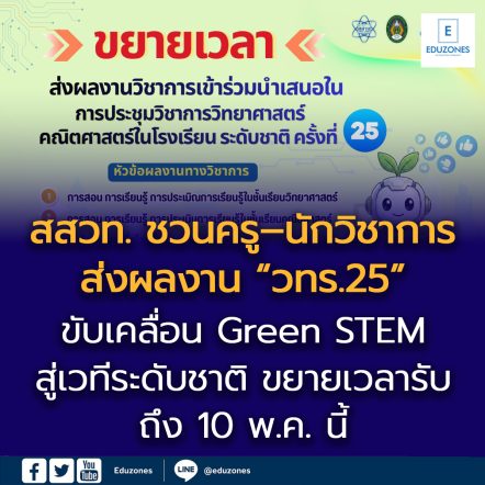 EZ Webmaster April 3, 2026 สสวท. ชวนครู–นักวิชาการส่งผลงาน “วทร.25” ขับเคลื่อน Green STEM สู่เวทีระดับชาติ ขยายเวลารับถึง 10 พ.ค. นี้ EZ Webmaster April 3, 2026 สถาบันส่งเสริมการสอนวิทยาศาสตร์และเทคโนโลยี (สสวท.) ร่วมกับมหาวิทยาลัยราชภัฏราชนครินทร์ (มรร.) และสมาคมครูวิทยาศาสตร์ คณิตศาสตร์และเทคโนโลยีแห่งประเทศไทย (สวคท.) ขยายเวลารับผลงานวิชาการเข้าร่วมนำเสนอในการประชุมวิชาการวิทยาศาสตร์ คณิตศาสตร์ในโรงเรียน ระดับชาติ ครั้งที่ 25 (วทร.25) ภายใต้หัวข้อ “สะเต็มศึกษาสีเขียวเพื่อโลกที่ยั่งยืน ผ่านการบูรณาการและนวัตกรรม (Green STEM Education for Global Sustainability: Integration and Innovation)” ซึ่งจะจัดขึ้นระหว่างวันที่ 24–26 กรกฎาคม 2569 ณ มหาวิทยาลัยราชภัฏราชนครินทร์ จังหวัดฉะเชิงเทรา โดยเปิดโอกาสให้ครูและนักวิชาการส่งผลงานใน 6 ประเด็นสำคัญ ได้แก่ การจัดการเรียนรู้วิทยาศาสตร์และคณิตศาสตร์ สะเต็มสีเขียว เทคโนโลยีและนวัตกรรมในห้องเรียนแห่งอนาคต รวมถึงความฉลาดรู้ด้าน AI และวิทยาการข้อมูล ผู้สนใจสามารถส่งผลงานได้ตั้งแต่วันนี้ถึง 10 พฤษภาคม 2569 ประกาศผลวันที่ 31 พฤษภาคม 2569 ดูรายละเอียดและส่งผลงานได้ที่ https://wtr25.rru.ac.th/sywfsc/ ติดตามข้อมูลเพิ่มเติมทางเว็บไซต์ https://wtr25.rru.ac.th และ Facebook วทร.25: https://www.facebook.com/WTR.IPST Continue Reading