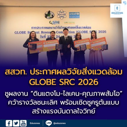 EZ Webmaster April 27, 2026 สสวท. ประกาศผลวิจัยสิ่งแวดล้อม GLOBE SRC 2026 ชูผลงาน “ดินแตงโม-ไลเคน-คุณภาพส้มโอ” คว้ารางวัลชนะเลิศ พร้อมเชิดชูครูต้นแบบสร้างแรงบันดาลใจวิทย์ EZ Webmaster April 27, 2026 รองศาสตราจารย์ ดร.ธีระเดช เจียรสุขสกุล ผู้อำนวยการสถาบันส่งเสริมการสอนวิทยาศาสตร์และเทคโนโลยี (สสวท.) เป็นประธานในพิธีมอบรางวัลการประกวดผลงานวิจัยวิทยาศาสตร์สิ่งแวดล้อม “GLOBE Student Research Competition (GLOBE SRC) 2026” ซึ่งจัดขึ้นระหว่างวันที่ 23–24 เมษายน 2569 ณ โรงแรมแอมบาสซาเดอร์ กรุงเทพมหานคร พร้อมด้วย ดร.เขมวดี พงศานนท์ ผู้อำนวยการฝ่ายบริหารเครือข่ายและพัฒนาครู สสวท. ร่วมแสดงความยินดี เวทีที่เปิดโอกาสให้เยาวชนไทยได้นำเสนอผลงานวิจัยจากบริบทจริงในท้องถิ่น สู่การต่อยอดองค์ความรู้ในระดับประเทศและนานาชาติ โดยมีผลงานผ่านเข้ารอบ จำนวน 70 ผลงาน ครอบคลุมระดับประถมศึกษา มัธยมศึกษาตอนต้น และมัธยมศึกษาตอนปลาย ผ่านการนำเสนอในรูปแบบโปสเตอร์และการสัมภาษณ์เชิงลึกจากคณะกรรมการผู้ทรงคุณวุฒิ อีกทั้ง ภายในงานยังมีการมอบรางวัลเชิดชูครู “GLOBE Thailand Teacher Shining Star… Continue Reading