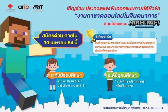 EZ Webmaster April 20, 2021 เชิญร่วม ประกวดแข่งขันออกแบบภายใต้หัวข้อ “งานกาชาดออนไลน์ในจินตนาการ” ด้วยโปรแกรม Minecraft EZ Webmaster April 20, 2021 “ลงทะเบียนสมัครด่วน ภายใน 30 เมษายน 2564” ชิงถ้วยรางวัลจากสมเด็จพระกนิษฐาธิราชเจ้า กรมสมเด็จพระเทพรัตนราชสุดาฯ สยามบรมราชกุมารี และทุนการศึกษา กิจกรรมที่ส่งเสริมทักษะด้านไอทีให้เยาวชนไทย o ระดับมัธยมศึกษา (ม.1-ม.6) และระดับอาชีวศึกษา (ปวช.1-3) o ระดับอุดมศึกษา (กำลังศึกษาปริญญาตรี หรือเทียบเท่า) สมัครได้ที่ link http://bit.ly/2NPgAWj การส่งผลงาน สามารถส่งผลงานมาได้ที่ RedcrossMinecraft2021@gmail.com สำหรับผู้ที่เคยส่งผลงานเข้ามาแล้ว สามารถพัฒนางานใหม่ แล้วส่งกลับมาอีกครั้ง หรือส่งผลงานเดิมได้ โดยส่งมาที่ RedcrossMinecraft2021@gmail.com ดูรายละเอียดโครงการเพิ่มเติมได้ที่ https://www.arit.co.th/assets/doc/red-cross-fair.pdf สนใจสอบถามข้อมูลเพิ่มเติม… Continue Reading