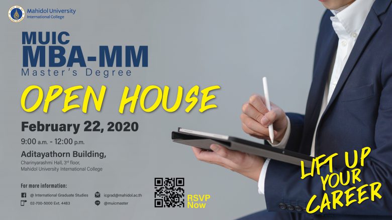 tui sakrapee February 6, 2020 MUIC MBA-MM Open House ที่ ม.มหิดล ศาลายา tui sakrapee February 6, 2020 วิทยาลัยนานาชาติ มหาวิทยาลัยมหิดล เปิดสอนหลักสูตรนานาชาติ ระดับบัณฑิตศึกษา จำนวน 2 หลักสูตร ได้แก่ หลักสูตรบริหารธุรกิจมหาบัณฑิต (MBA) และหลักสูตรการจัดการมหาบัณฑิต สาขาวิชาการจัดการท่องเที่ยวและการบริการนานาชาติ (MM) โดยหลักสูตรได้รับการยอมรับในระดับสากลในฐานะผู้นำในการให้การศึกษาที่มีคุณภาพ เพื่อพัฒนาบัณฑิตให้รอบรู้รอบด้าน ส่งเสริมการวิจัย และบริการที่มีส่วนร่วมในสังคมโลกที่เป็นนวัตกรรมและยั่งยืนให้มากขึ้น ทางวิทยาลัยฯ ได้กำหนดจัดกิจกรรม MBA-MM Open House เพื่อแนะนำหลักสูตรและประชาสัมพันธ์การรับสมัครนักศึกษาใหม่ ในวันเสาร์ที่ 22 กุมภาพันธ์ 2563 ระหว่างเวลา 09.00 – 12.00 น. ณ ห้องประชุมจรินทร์ยารัศมิ์ ชั้น 3 อาคารอทิตยาทร วิทยาลัยนานาชาติ มหาวิทยาลัยมหิดล วิทยาเขตศาลายา สอบถามรายละเอียดได้ที่ สำนักงานบัณฑิตศึกษาวิทยาลัยนานาชาติ (iGS) โทร: 02 700 5000 ต่อ 4483 โทรศัพท์มือถือ: 096 685 1334 หรือที่เว็บไซต์ https://muic.mahidol.ac.th/eng/programs/graduate-program/ Continue Reading