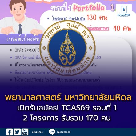 EZ Webmaster October 5, 2025 คณะพยาบาลศาสตร์ มหาวิทยาลัยมหิดล เปิดรับสมัคร TCAS69 รอบที่ 1 (Portfolio) EZ Webmaster October 5, 2025 🩺✨ คณะพยาบาลศาสตร์ มหาวิทยาลัยมหิดล เปิดรับสมัคร #TCAS69 รอบที่ 1 (Portfolio) ประจำปีการศึกษา 2569 🎓 📌 จำนวนรับทั้งหมด 170 คน 🔵 โครงการ Portfolio : 130 คน 🔴 โครงการ Portfolio สองภาษา : 40 คน นี่คือโอกาสก้าวสู่เส้นทาง “พยาบาลวิชาชีพ”ผู้ดูแลชีวิต และสร้างคุณค่าให้สังคม 🌍💙… Continue Reading