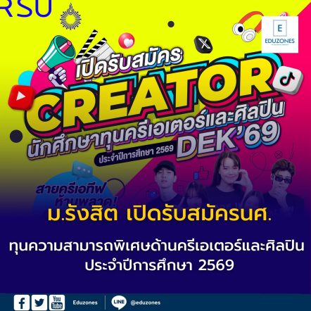 EZ Webmaster January 29, 2026 ม.รังสิต เปิดรับสมัครนศ.ทุนความสามารถพิเศษด้านครีเอเตอร์และศิลปิน ประจำปีการศึกษา 2569 EZ Webmaster January 29, 2026 ม.รังสิต เปิดรับสมัครนศ.ทุนความสามารถพิเศษด้านครีเอเตอร์และศิลปิน ประจำปีการศึกษา 2569 มหาวิทยาลัยรังสิต เปิดรับสมัครนักศึกษาทุนความสามารถพิเศษด้านครีเอเตอร์และศิลปิน ประจำปีการศึกษา 2569 ตั้งแต่บัดนี้จนถึงวันที่ 9 เมษายน 2569 โดยผู้ที่ผ่านการคัดเลือกจะได้รับการยกเว้นค่าหน่วยกิตและค่าบำรุงการศึกษา จำนวน 10 ทุน มีคุณสมบัติดังนี้ สำเร็จการศึกษา ม.6 หรือ เทียบเท่า เข้าศึกษาในมหาวิทยาลัยรังสิต ในคณะ/สาขาวิชา ที่กำหนดไว้ ปีการศึกษา 2567หรือนักศึกษาที่กำลังศึกษาอยู่ในปัจจุบัน เป็นผู้มีความคิดสร้างสรรค์และมีความสามารถด้านYoutuber หรือสร้างคอนเทนต์ สื่อออนไลน์ในรูปแบบของตนเองบนแพลตฟอร์มต่างๆ ได้แก่ Facebook, Instagram, Twitter, Tiktok, Youtube เป็นผู้มียอดติดตาม/… Continue Reading
