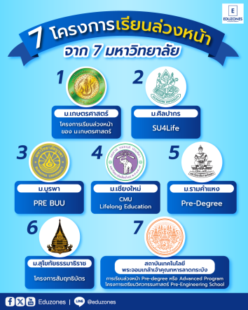 EZ Webmaster July 21, 2025 8 โครงการเรียนล่วงหน้า จาก 8 มหาวิทยาลัย! EZ Webmaster July 21, 2025 8 โครงการเรียนล่วงหน้า จาก 8มหาวิทยาลัย! ไหนมีใครที่เป็นน้อง ๆ นักเรียนมัธยมแล้วอยากทดลองเรียนคณะต่าง ๆ ในมหาวิทยาลัยก่อนจะเข้าศึกษาต่อจริงบ้างคะ? หรือว่าจะเป็นพี่ ๆ นักศึกษา พี่ ๆ วัยทำงานที่อยากแบ่งเวลามาเรียนในสิ่งที่สนใจ สิ่งที่ตัวเองอยากศึกษาเพิ่มเติมบ้างคะ? วันนี้ทาง Eduzones ได้รวบรวม 8 โครงการเรียนล่วงหน้าจาก 8 มหาวิทยาลัยมาฝากกันค่ะ โครงการเรียนล่วงหน้าคืออะไร?โครงการเรียนล่วงหน้า คือ โครงการที่เป็นให้นักเรียน นักศึกษา และวัยทำงาน ได้ลงทะเบียนเรียนบางรายวิชาจากมหาวิทยาลัยโดยมีหลักสูตรที่เหมือนกับนักศึกษาในมหาวิทยาลัยนั้น เป๊ะ ๆ… Continue Reading