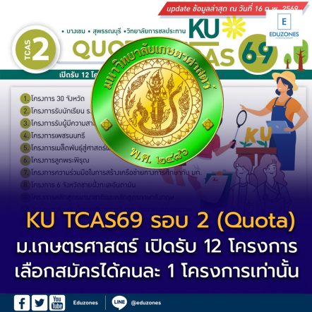 EZ Webmaster February 16, 2026 ม.เกษตรศาสตร์ เปิดรับ TCAS69 รอบ 2 (Quota) รวม 12 โครงการ สมัครได้แล้ววันนี้! EZ Webmaster February 16, 2026 📣 ม.เกษตรศาสตร์ เปิดรับ TCAS69 รอบ 2 (Quota) รวม 12 โครงการ สมัครได้แล้ววันนี้! มหาวิทยาลัยเกษตรศาสตร์ (KU) ประกาศเปิดรับสมัครนักศึกษาใหม่ TCAS รอบที่ 2 โควตา ประจำปีการศึกษา 2569 ครอบคลุมทั้งวิทยาเขตบางเขน สุพรรณบุรี และวิทยาลัยการชลประทาน โดยเปิดรับรวมทั้งสิ้น 12 โครงการ ให้ผู้สมัครเลือกได้คนละ 1 โครงการเท่านั้น 📅 เปิดรับสมัคร: 16… Continue Reading