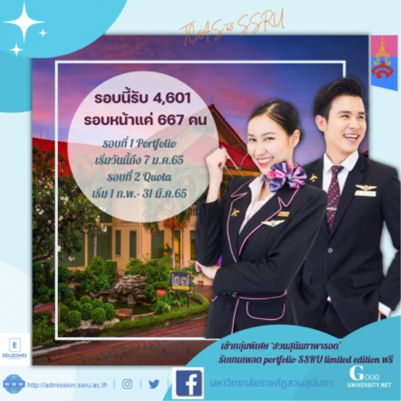 tui sakrapee November 22, 2021 “สวนสุนันทา” พารอด รับรอบ 1 ถึง 4,601 ที่นั่ง สมัครวันนี้ยังมีโอกาส – 7 ม.ค.65 tui sakrapee November 22, 2021 มหาวิทยาลัยราชภัฏสวนสุนันทา เปิดรับสมัครบุคคลเข้าศึกษาในมหาวิทยาลัยราชภัฏสวนสุนันทาภาคปกติ ระดับปริญญาตรี ประจำปีการศึกษา 2565 (รอบที่ 1 Portfolio) จำนวน 4,601 ที่นั่ง ระหว่างวันที่ 1 ตุลาคม 2564 – 7 มกราคม 2565 คณะ/วิทยาลัยที่เปิดรับสมัคร คณะครุศาสตร์ 357 คน คณะวิทยาศาสตร์และเทคโนโลยี 378 คน คณะเทคโนโลยีอุตสาหกรรม 321 คน คณะมนุษยศาสตร์และสังคมศาสตร์ 402 คน… Continue Reading